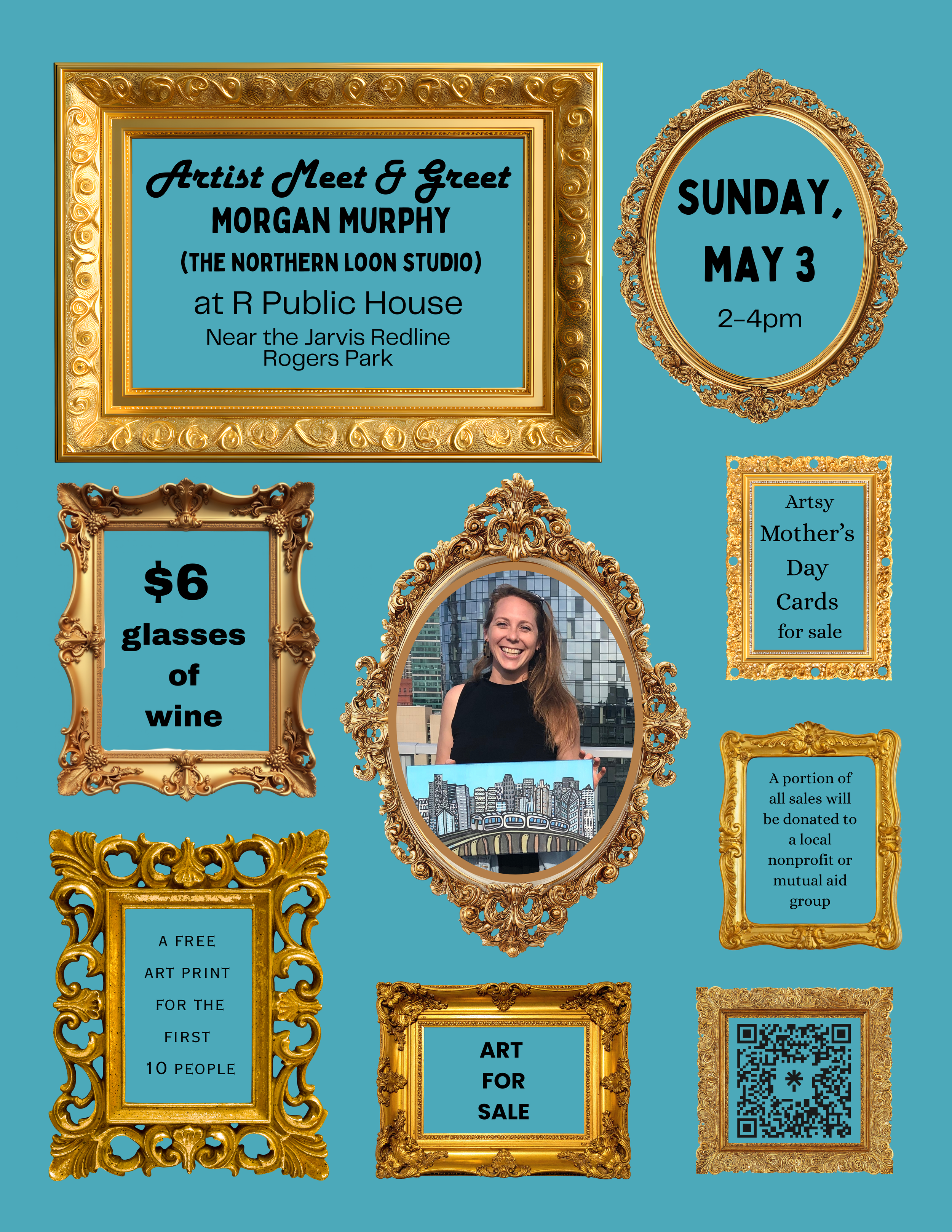Come to R Public House in Rogers Park (near the Jarvis Red-line stop) for an Artist Meet & Greet! Morgan is one of the featured artists at R Public House this spring and to celebrate her artwork being on the walls, she’s eager to connect with community members and art-lovers alike. There will be art of all sizes for sale, artsy mothers’ day cards for sale, $6 glasses of wine, and a free print for the first 10 people to come through. A portion of all sales will be donated to a local non-profit or mutual aid group.
